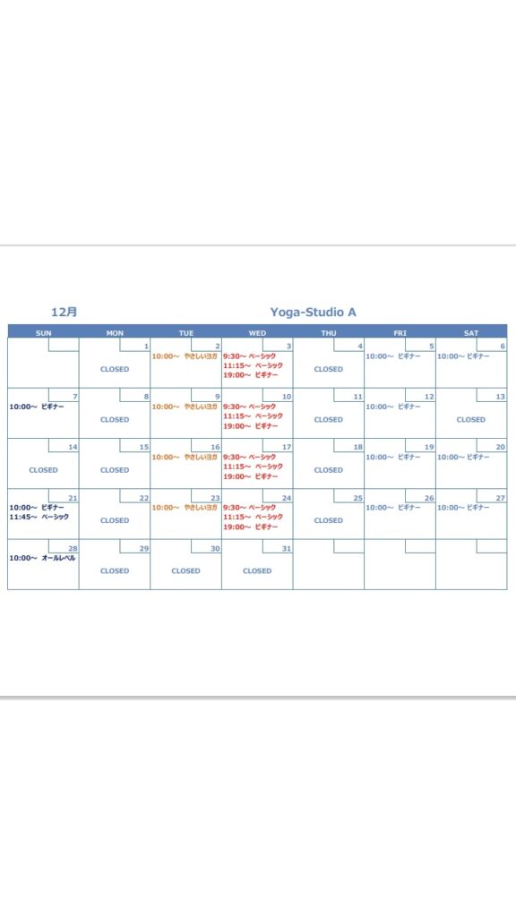 12月スケジュール 2025年11月11日 最終更新日時 : 2025年11月11日 太田あゆみ 12/7(日)ベーシッククラス、12/13(土)、14(日)は講師研修の為、休講とさせて頂きます。 年末年始は12/29(月)〜1/3(土)までお休みさせて頂きますので、宜しくお願い致します。 Screenshot FacebookXHatena