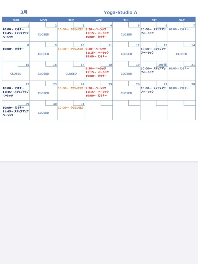 3月スケジュール 2026年2月3日 最終更新日時 : 2026年2月9日 太田あゆみ 3/3(火•祝)10:00〜ビギナークラスとなります。 3/14(土)、15(日)、17(火)は研修の為、全クラス休講となります。 Screenshot FacebookXHatena